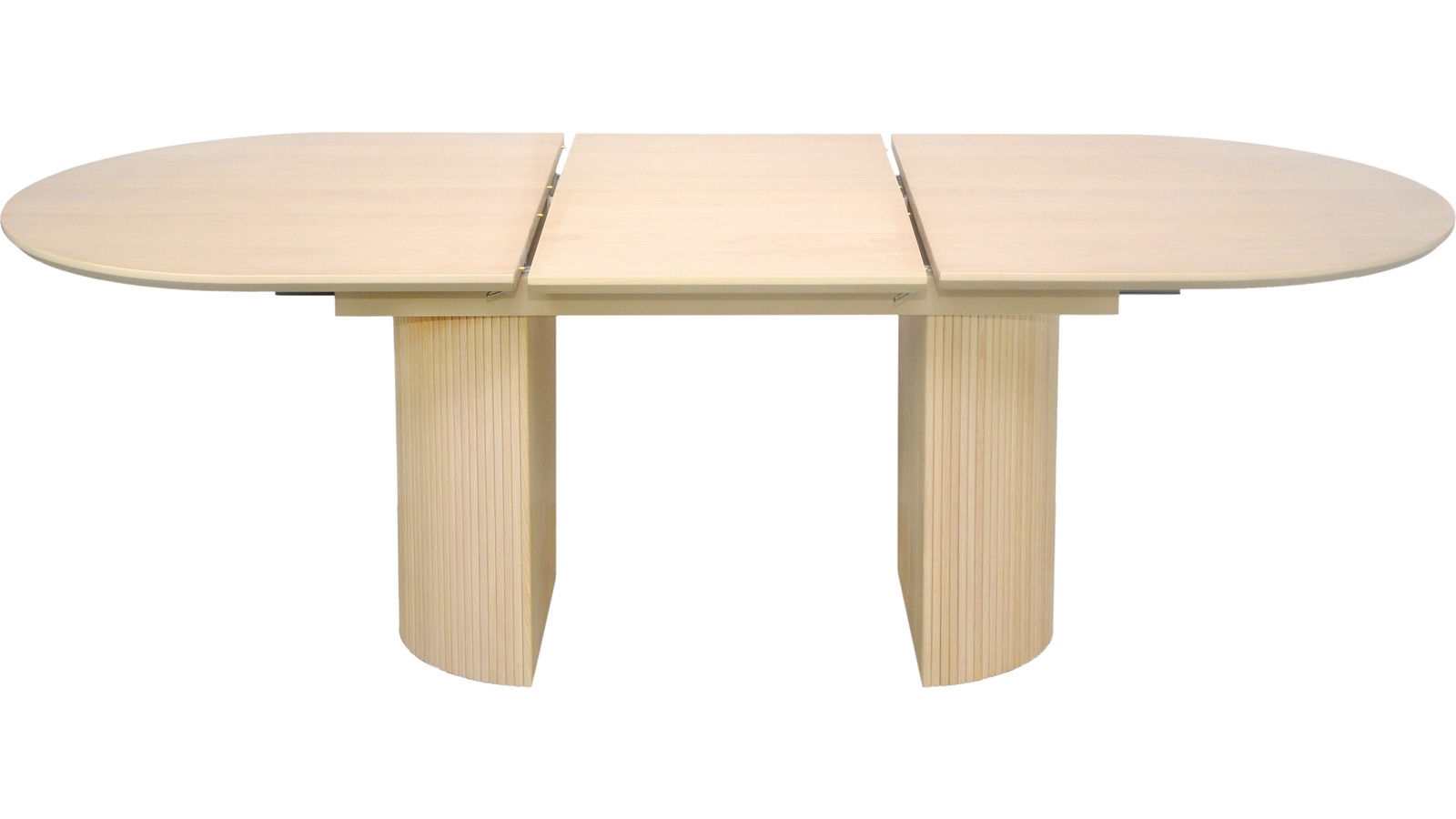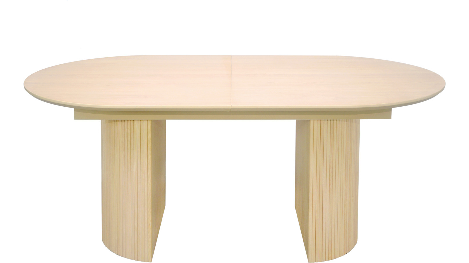 Gediget matbord i vitpigmenterat trä. Bordet är ovalt och kan förlängas med en iläggskiva av butterflymodell.