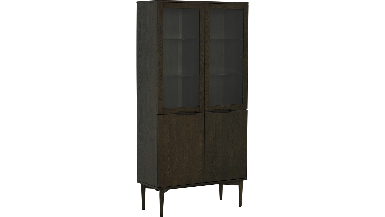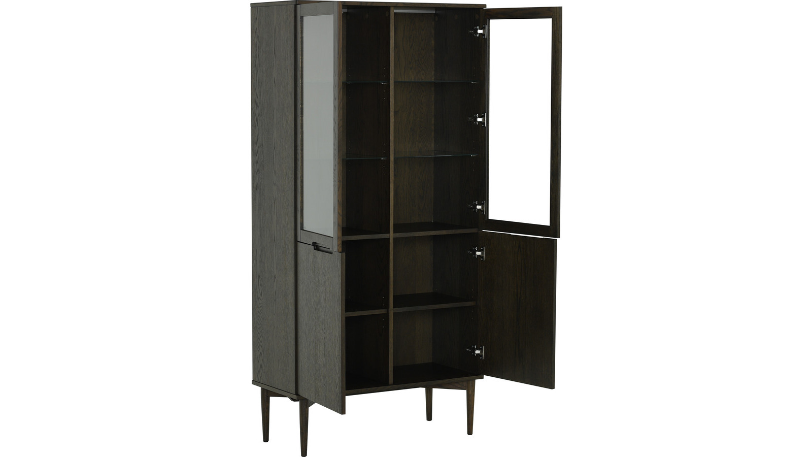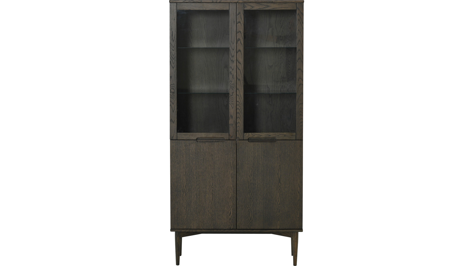 Vitrinskåp med två glasdörrar och två trädörrar med softclose. Två justerbara hyllplan i glas innanför glasdörrarna och ett justerbart hyllplan i trä innanför trädörrarna. Mörkbrun lackad ekfanér. Ledbelysning ingår.