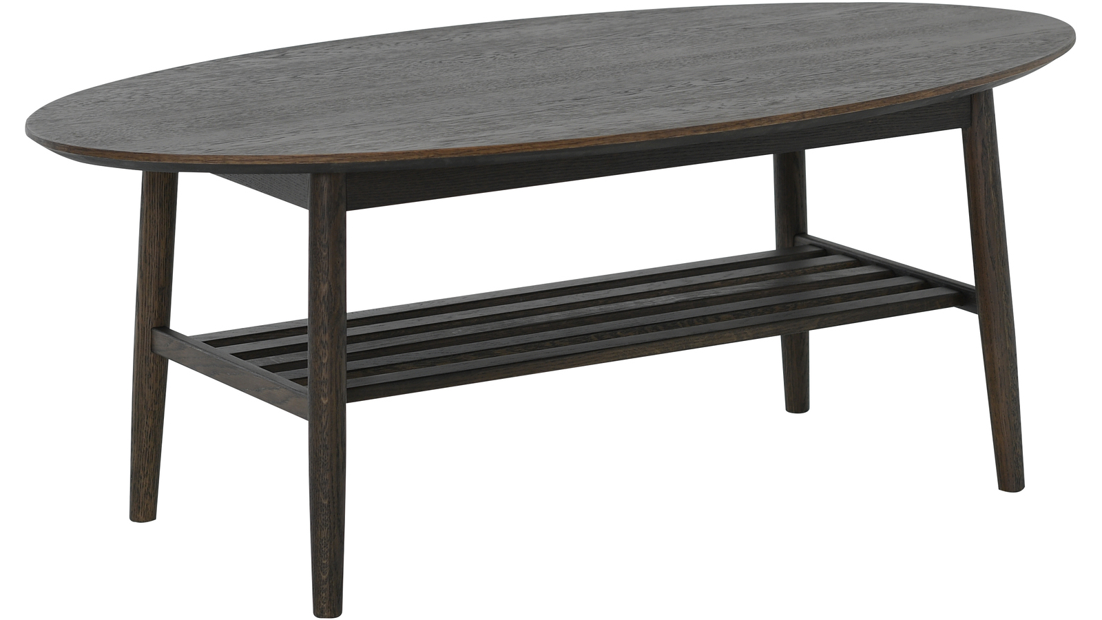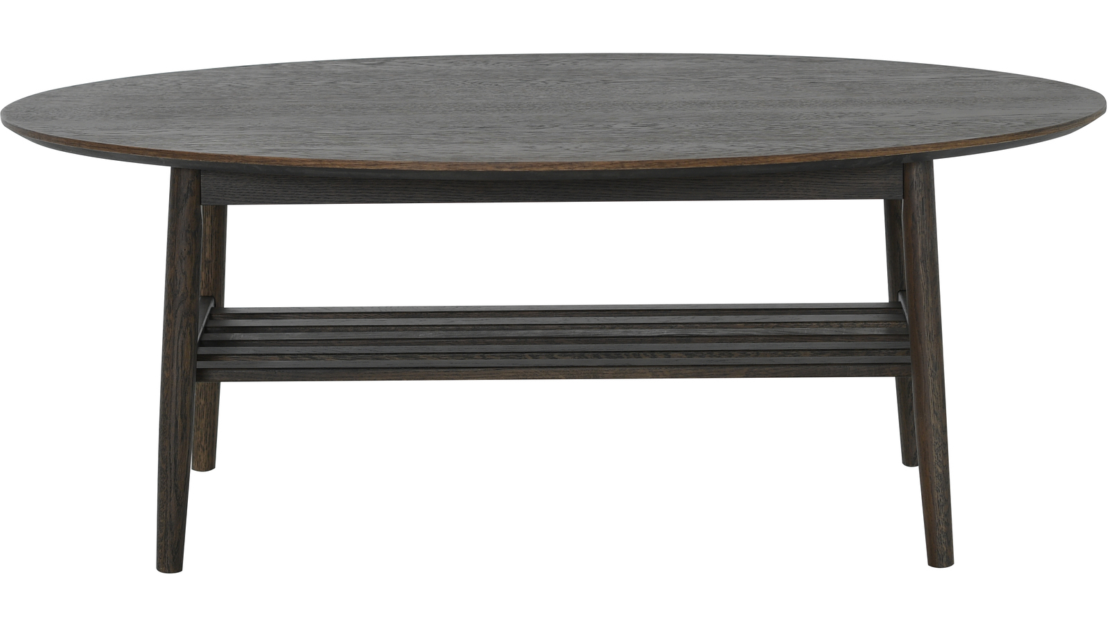 Ovalt soffbord i mörkbrun ek och med ribbad underhylla.